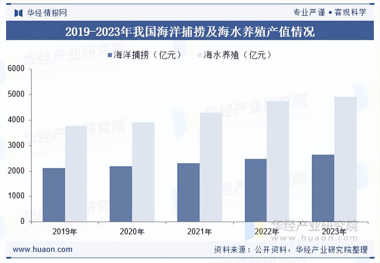 我国是世界上最大的渔业生产国。改革开放以来,渔业产量迅速增长,2023年我国渔业总产值达到了1.61亿元。其中海洋养殖年产值达4885亿元,占渔业总产值的比重的31%;海洋捕捞年产值达2618亿元,占渔业总产值的比重的16%;水产种苗(海水+淡水)年产值达276亿元,占渔业总产值的比重的6%,三者合计,我国海洋渔业总产值已接近8000亿元。