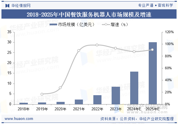 在餐饮服务机器人企业的不断加码下,拓宽了餐饮机器人的种类,为餐饮企业提供了更为多样的选择空间。随着底层技术的进步,再加上疫情的催化,越来越多的企业开始布局餐饮机器人行业,推动行业市场规模不断扩张。近年来国内餐饮服务机器人市场规模迅速增长,预计于2025年中国餐饮服务机器人市场规模将突破30亿美元。