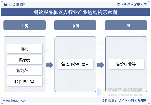 餐饮服务机器人行业产业链上游为核心零部件与技术供应商,主要包括电机、传感器、智能芯片和软件技术等;产业链中游为整机制造商及系统集成环节,主要包括设计与制造;产业链下游应用领域主要是餐饮行业。